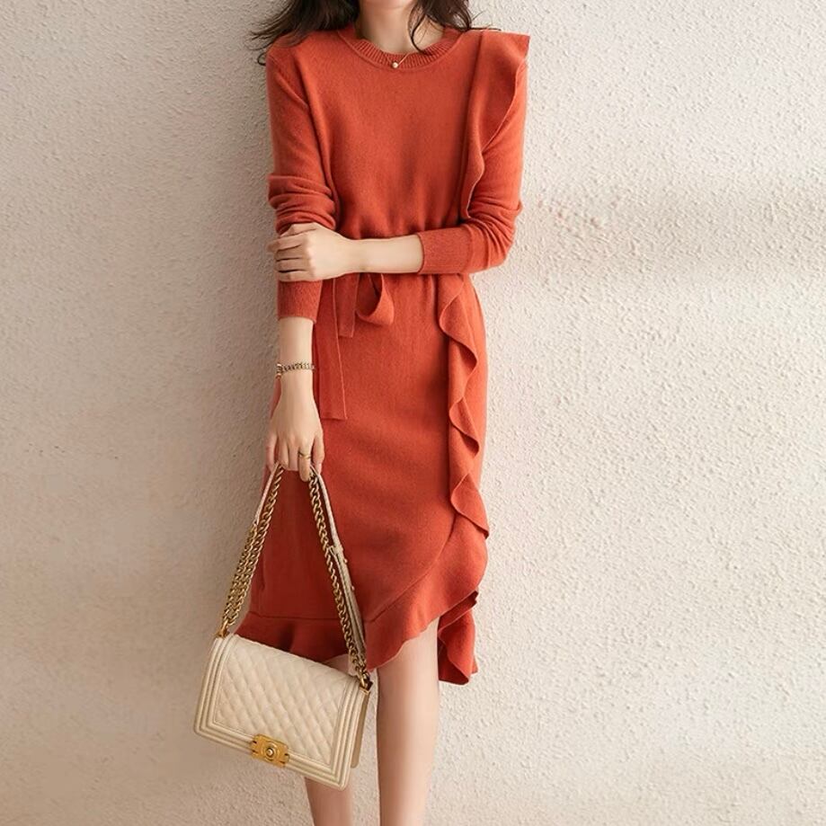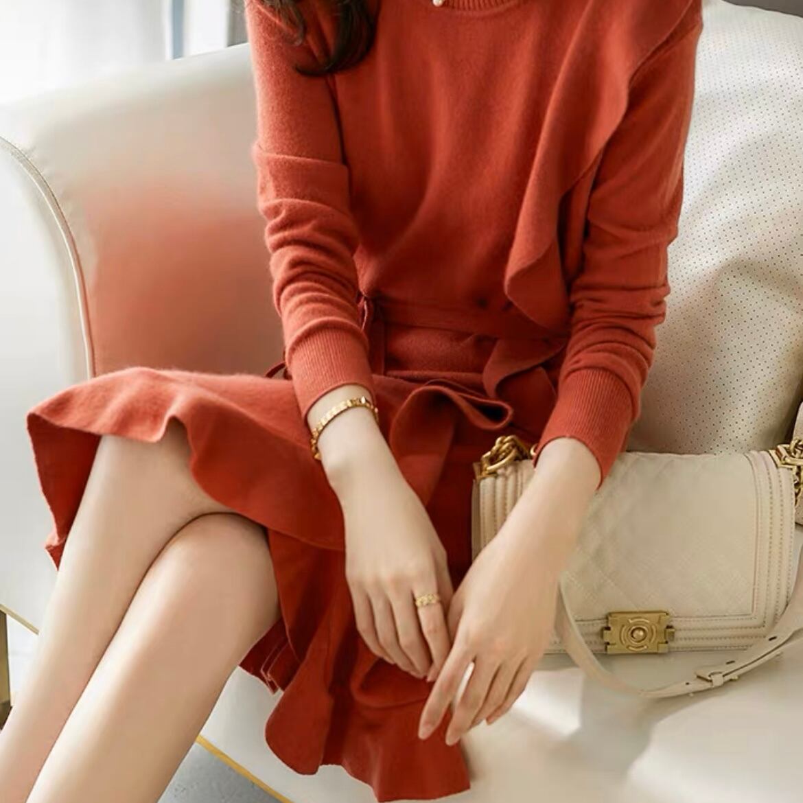 このニットドレスワンピースは、女性らしさを引き立てるフェミニンなデザインが特徴です。トレンドのフリルがアクセントとなり、上半身のデコルテラインやウエストのラインを美しく魅せるシルエットに仕上げました。暖かさも兼ね備えているため、秋冬の季節にもぴったりです。ラウンドネックが上品で、肩から流れるシフォンプリーツが軽やかな一枚。ウエストリボンあり。
