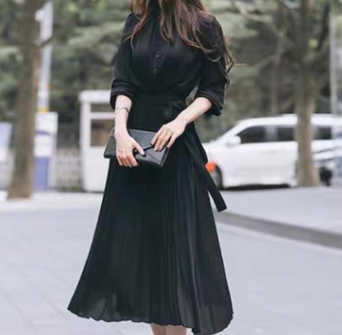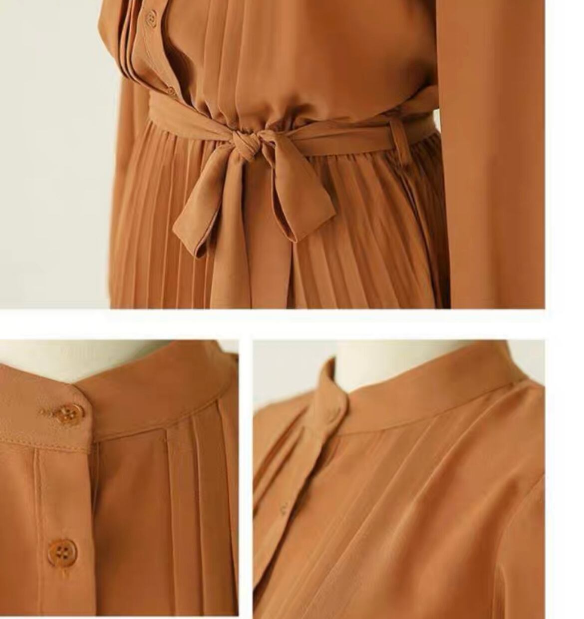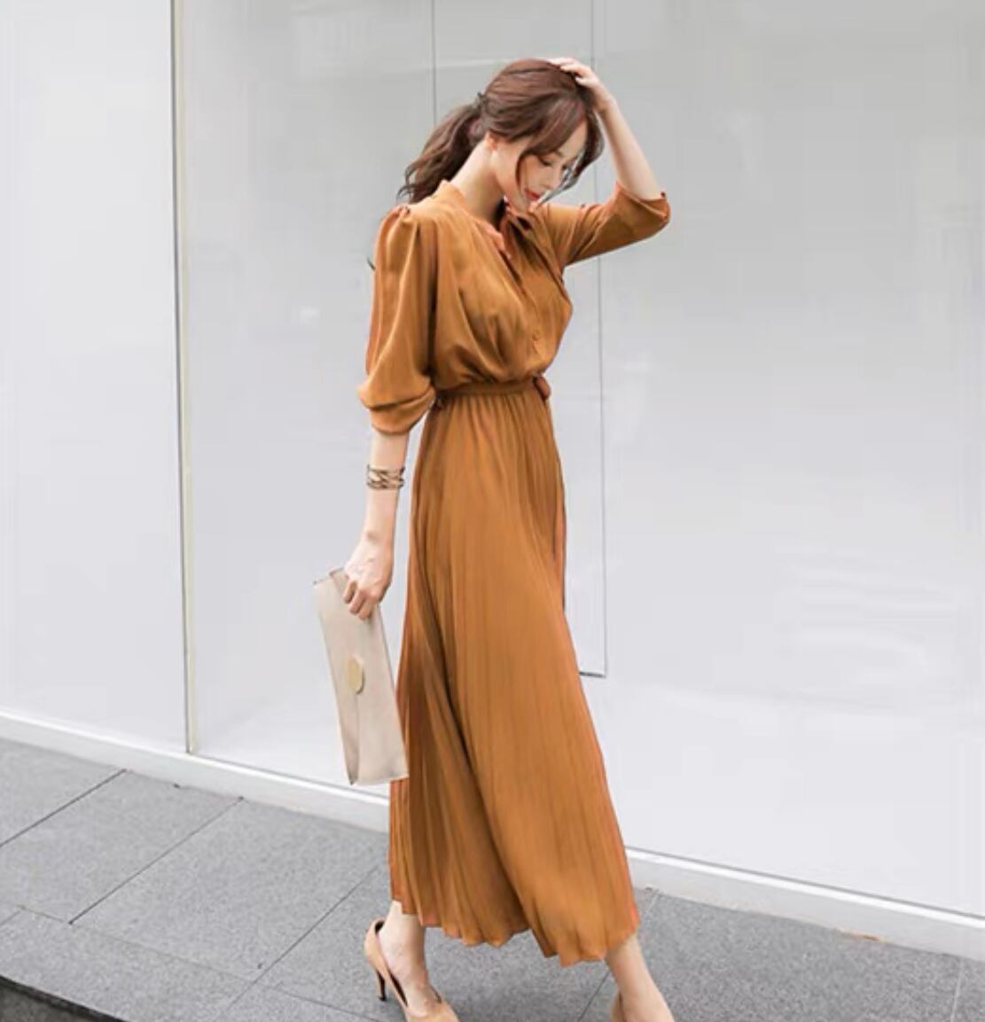 長袖プリーツドレスワンピース D003