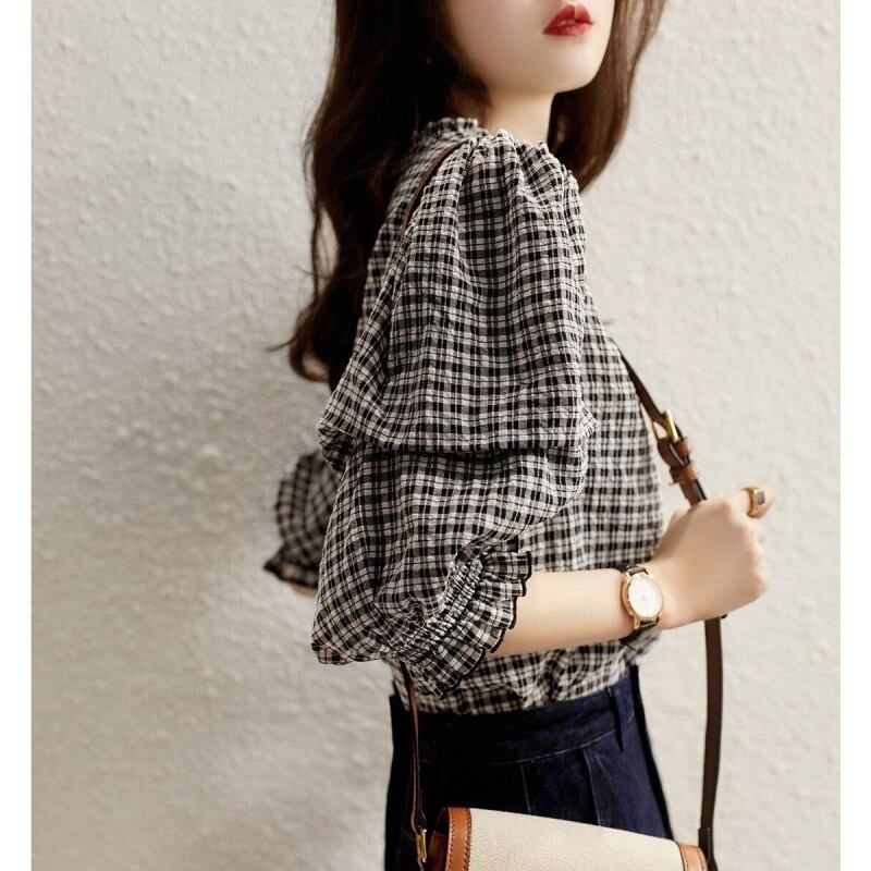 パフスリーブチェックブラウス 七分袖 T008
