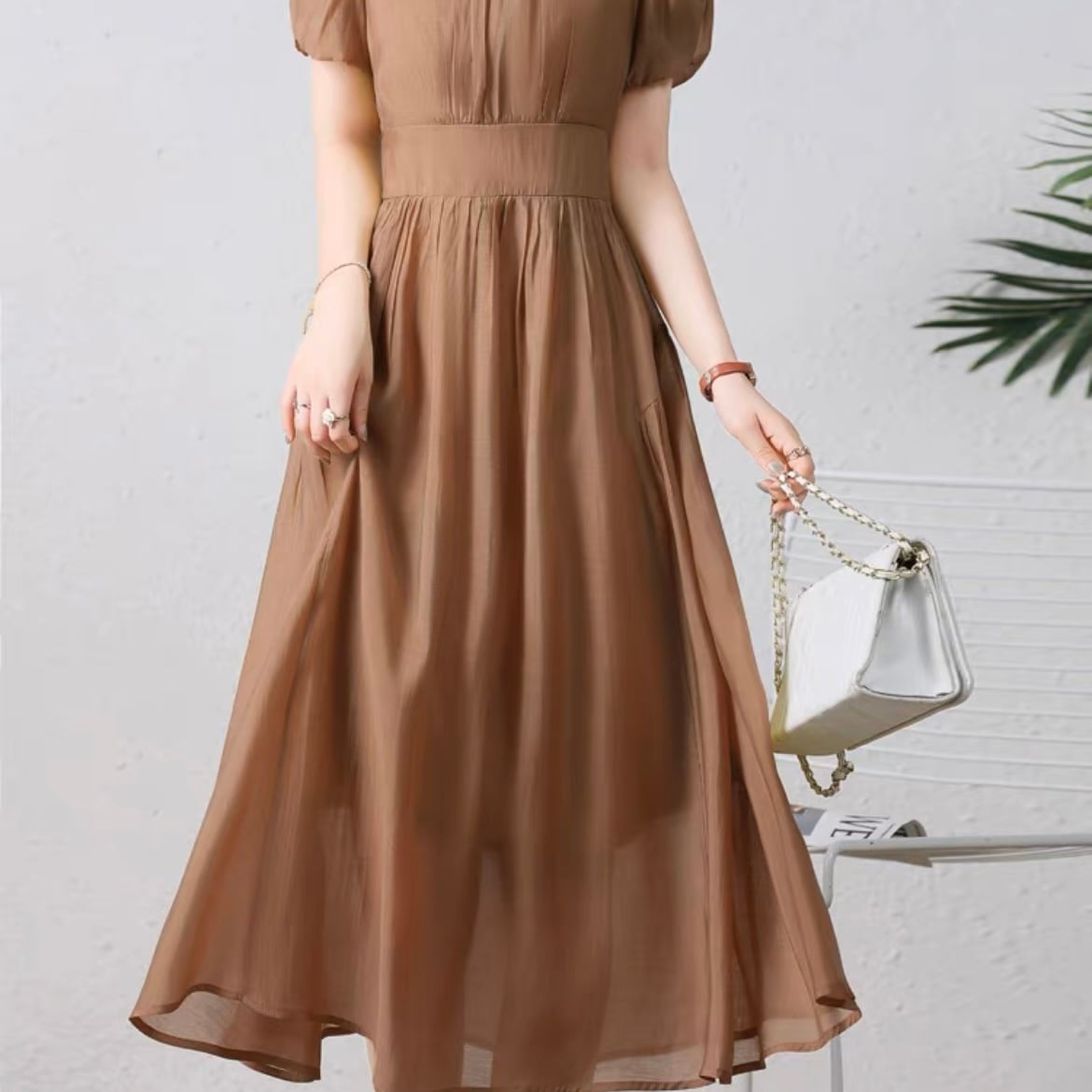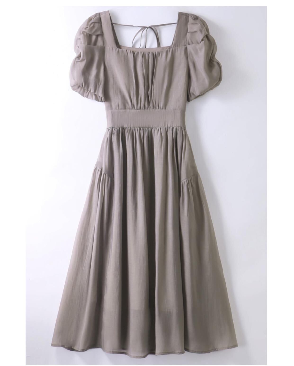 テンセル素材スクエアカラーパフスリーブドレス D011