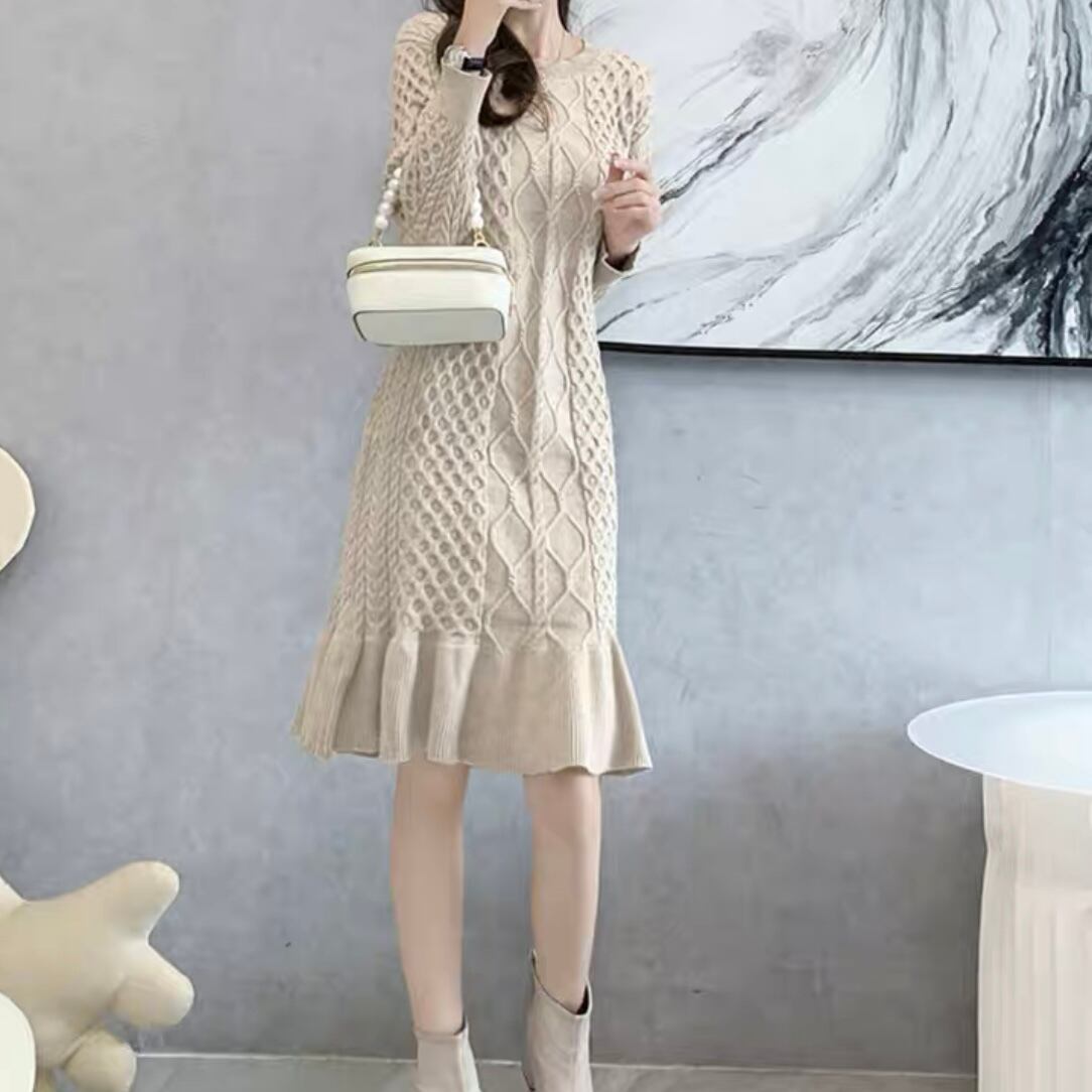 暖かみのあるニット生地で作られたワンピースです。程よい長さで女性らしい印象を与えます。シンプルなデザインなので、さまざまなアクセサリーやアウターとの相性も抜群です。また、ニット素材は柔らかく伸縮性があるため、着心地も抜群です。 このワンピースは、寒い季節のおしゃれに加え、暖かい気持ちも感じられる一枚です。ぜひ、お手元にお迎えください。