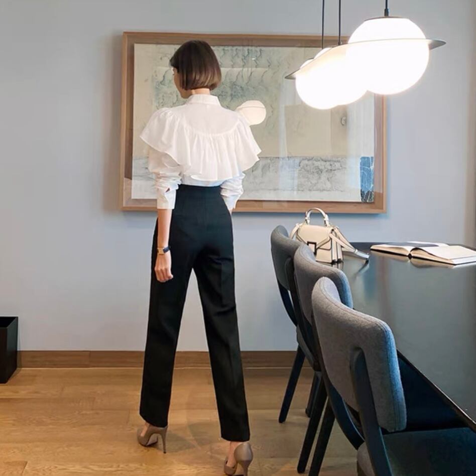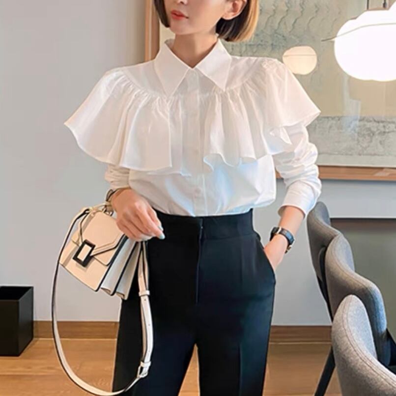 このコットン長袖フリルブラウスは、女性らしいデザインが魅力です。フリルが施された袖口と衿元が、上品な印象を与えます。一枚で女性らしさと上品さを引き立ててくれます。オフィスやデート、お出かけなど様々なシーンで活躍してくれること間違いありません。