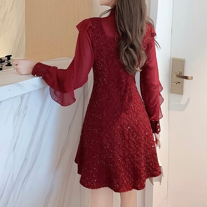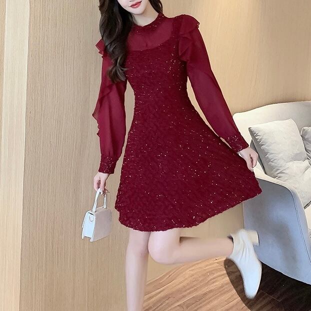 フリル袖が可愛らしいワンピース。女性らしさを引き立てるデザインが特徴です。程よくフィットするシルエットで、スタイルも良く見えること間違いなし。