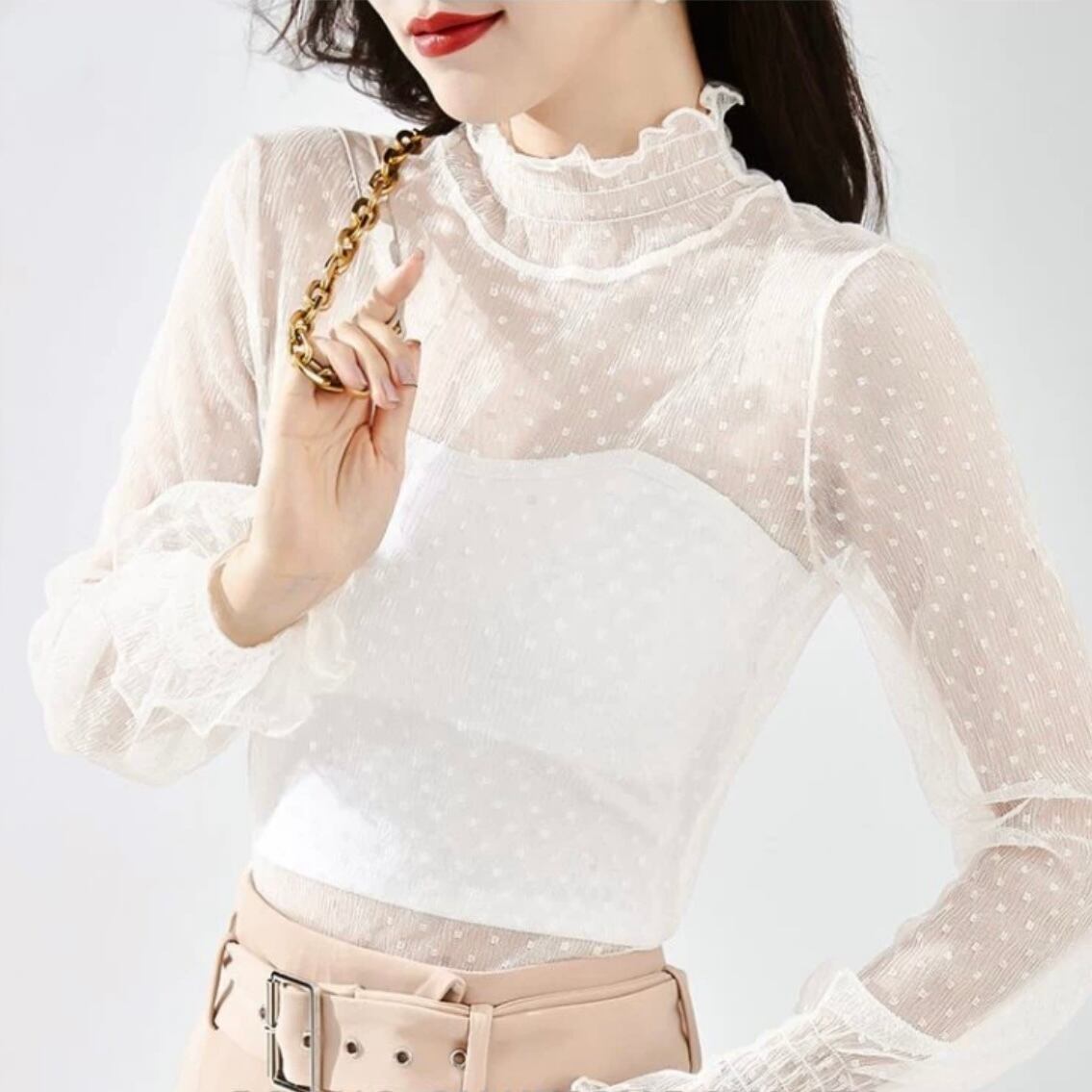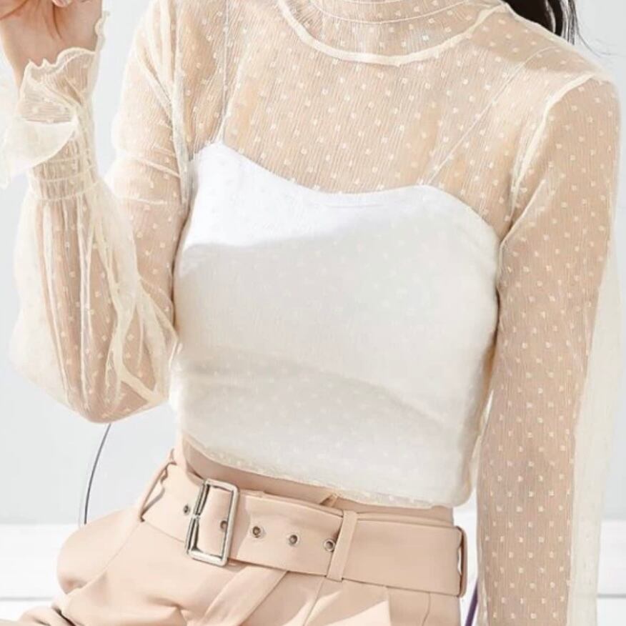 シアーレースカットソートップスは、繊細なレースが透け感を演出し、女性らしい上品な印象を与えます。透け感がありながらも肌見せ過ぎないバランスの絶妙さがポイントです。