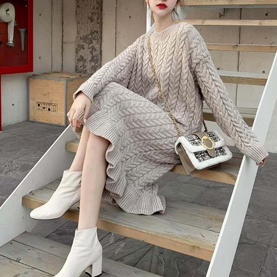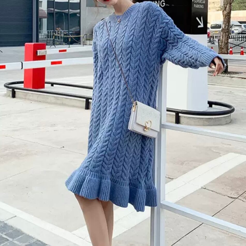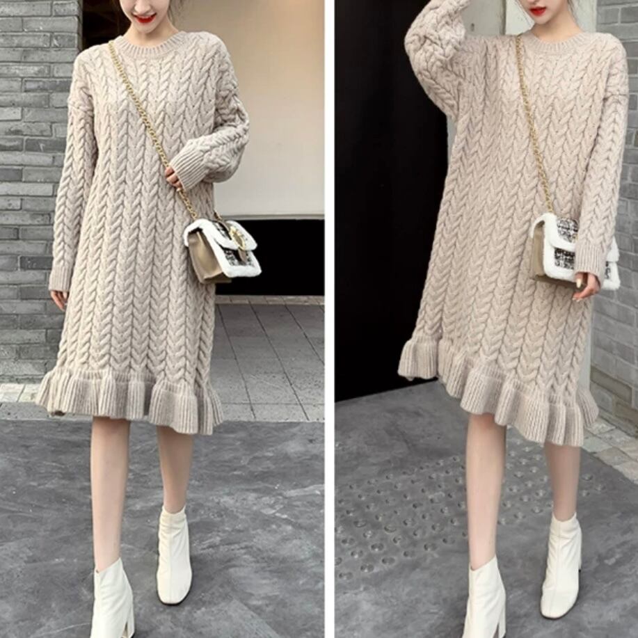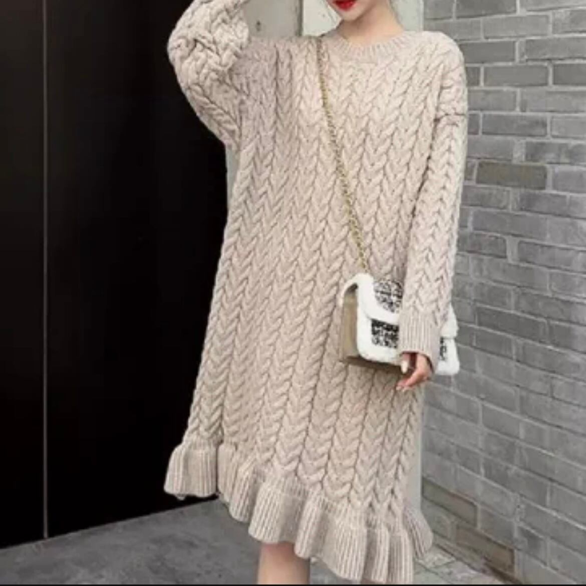 裾のフリルが可愛いらしいニットワンピース。柔らかく暖かい素材で着心地も抜群です。自宅で手軽に洗えるので、お手入れも簡単です。