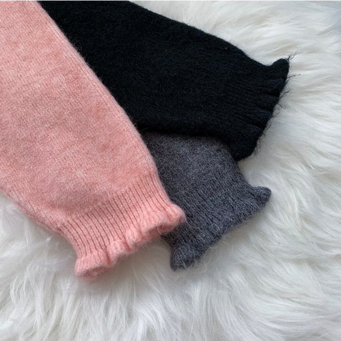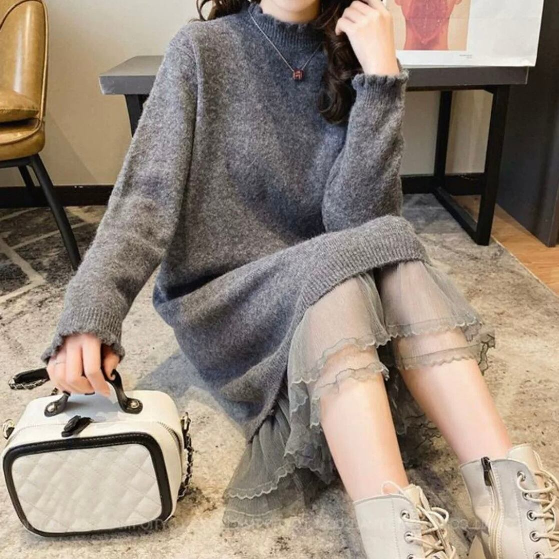 透け感のあるチュールの裾フリルが特徴的なニットワンピース。一枚できまるレイヤード風デザイン。フリルな袖口もかわいいワンピースです。ゆったりしたラインで誰でも自信を持ってお洒落を楽しむことができるでしょう。