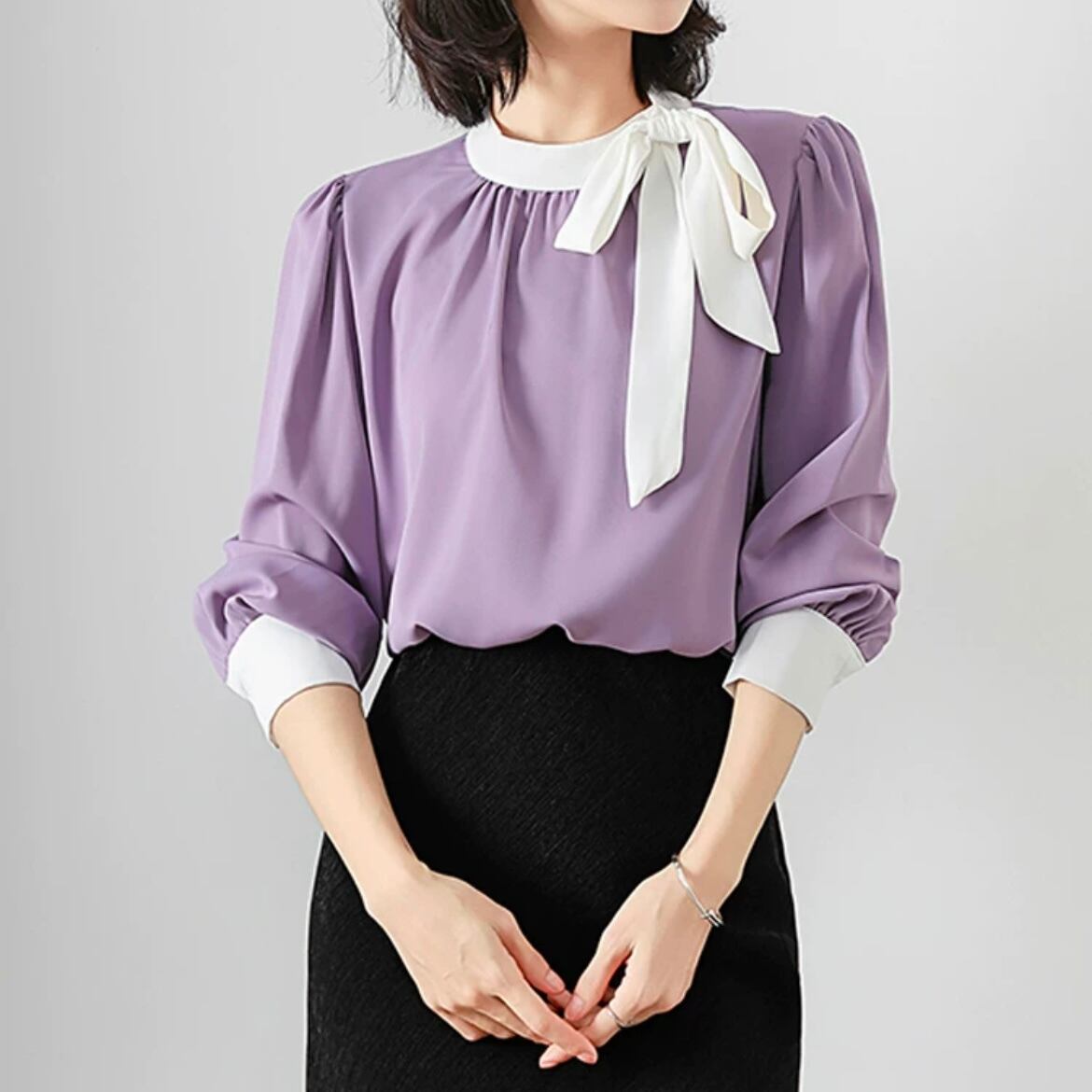 パンツスタイルやジャケットのインナーにオフィシャルに着こなせるブラウスです。