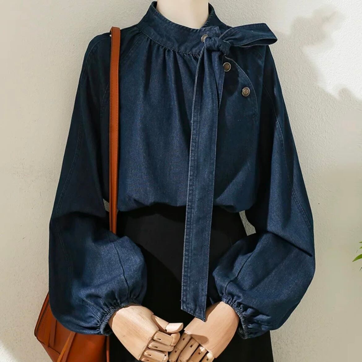 リボンタイデニムブラウス T090